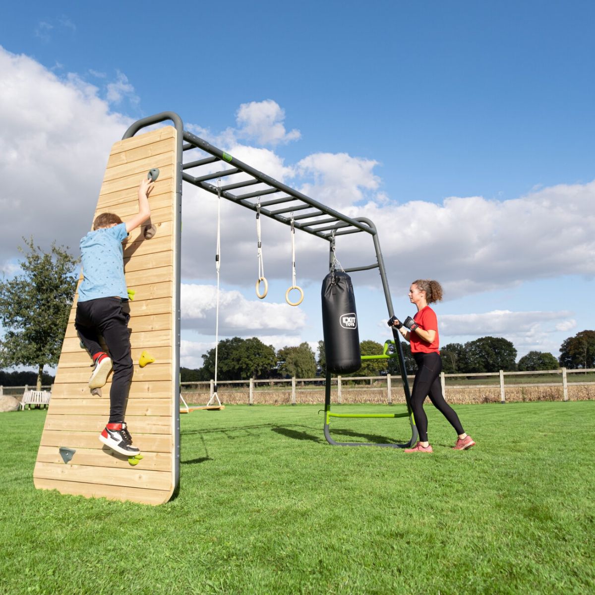 ¿Buscas una solución integral que permita a tus hijos jugar al aire libre a diario mientras tú disfrutas del deporte en tu propio jardín? La barra de mono EXIT GetSet MB320 es la opción ideal para familias activas. Con una robusta estructura de cuatro metros de largo y ocho accesorios incluidos, desde un saco de boxeo hasta un rocódromo, este equipo ofrece infinita variedad, desafío y diversión para todas las edades. Ya sea jugando, haciendo ejercicio o haciendo ejercicio juntos, el MB320 lo hace posible. Juego al aire libre con infinitas posibilidades Para niños llenos de energía e imaginación Con el GetSet MB320, cada día se convierte en una nueva aventura. Tus hijos pueden trepar, columpiarse, balancearse e imaginar con el columpio, el rocódromo, las asas y las anillas de gimnasia incluidos. Este equipo fomenta el juego activo y creativo al aire libre, donde el desarrollo motor y la diversión van de la mano. Deja que creen sus propias reglas, jueguen a roles o se enfrenten a retos deportivos. Nota: Para usar las barras de mono de forma segura, primero debe quitar todos los accesorios.