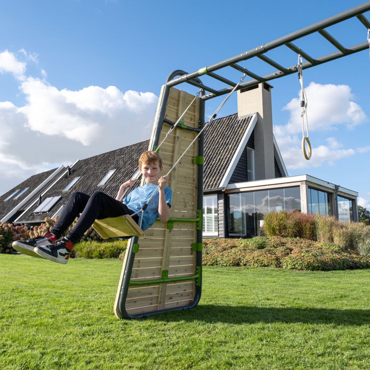 El EXIT GetSet MB320 es el equipo más completo de su gama. Gracias a sus cuatro metros de longitud, ofrece espacio para varios miembros de la familia a la vez, sin sacrificar la facilidad de uso. Puede montarlo usted mismo fácilmente y crear una zona de juego y ejercicio completa en un solo día que todos disfrutarán. ¡GetSet y listo: activos al aire libre juntos!