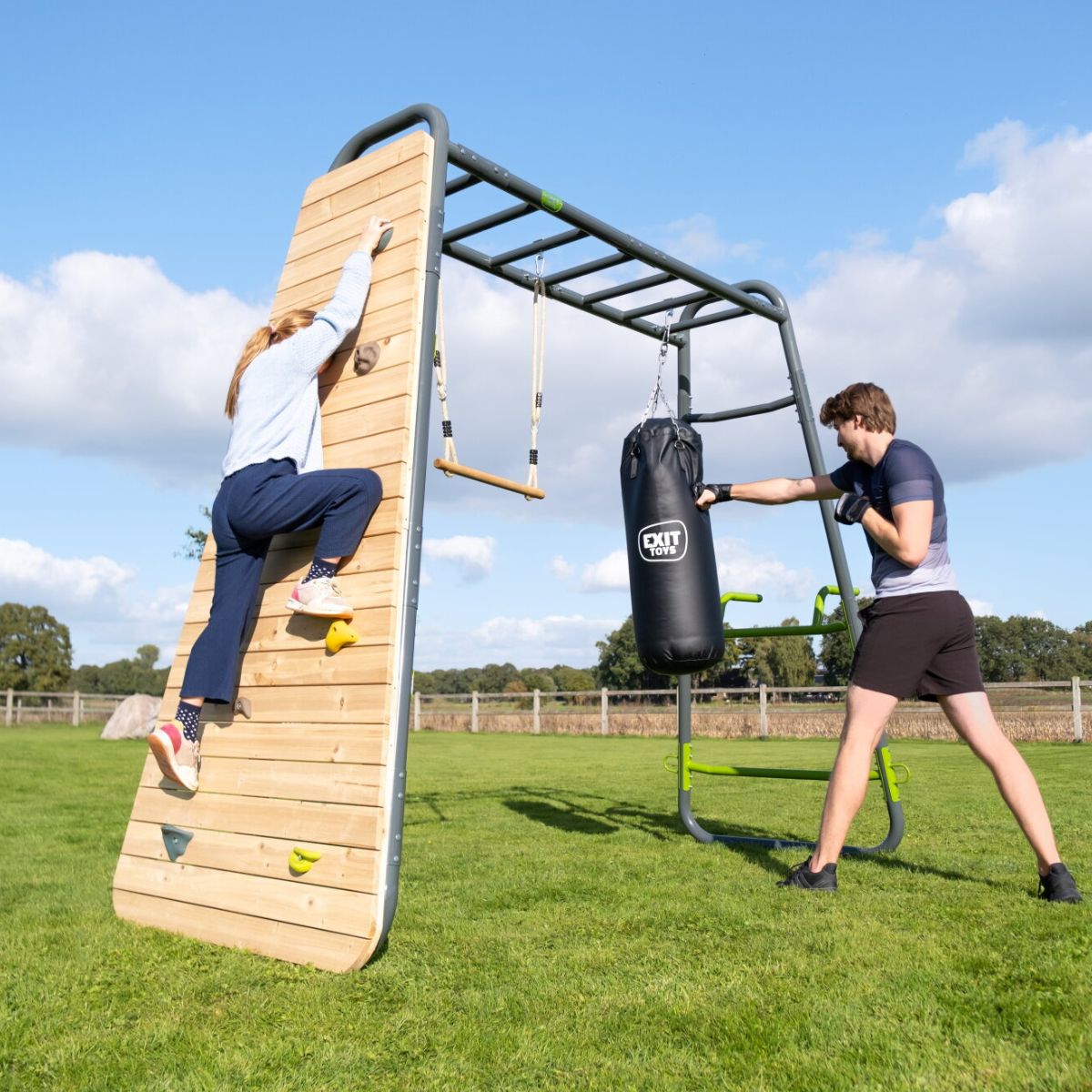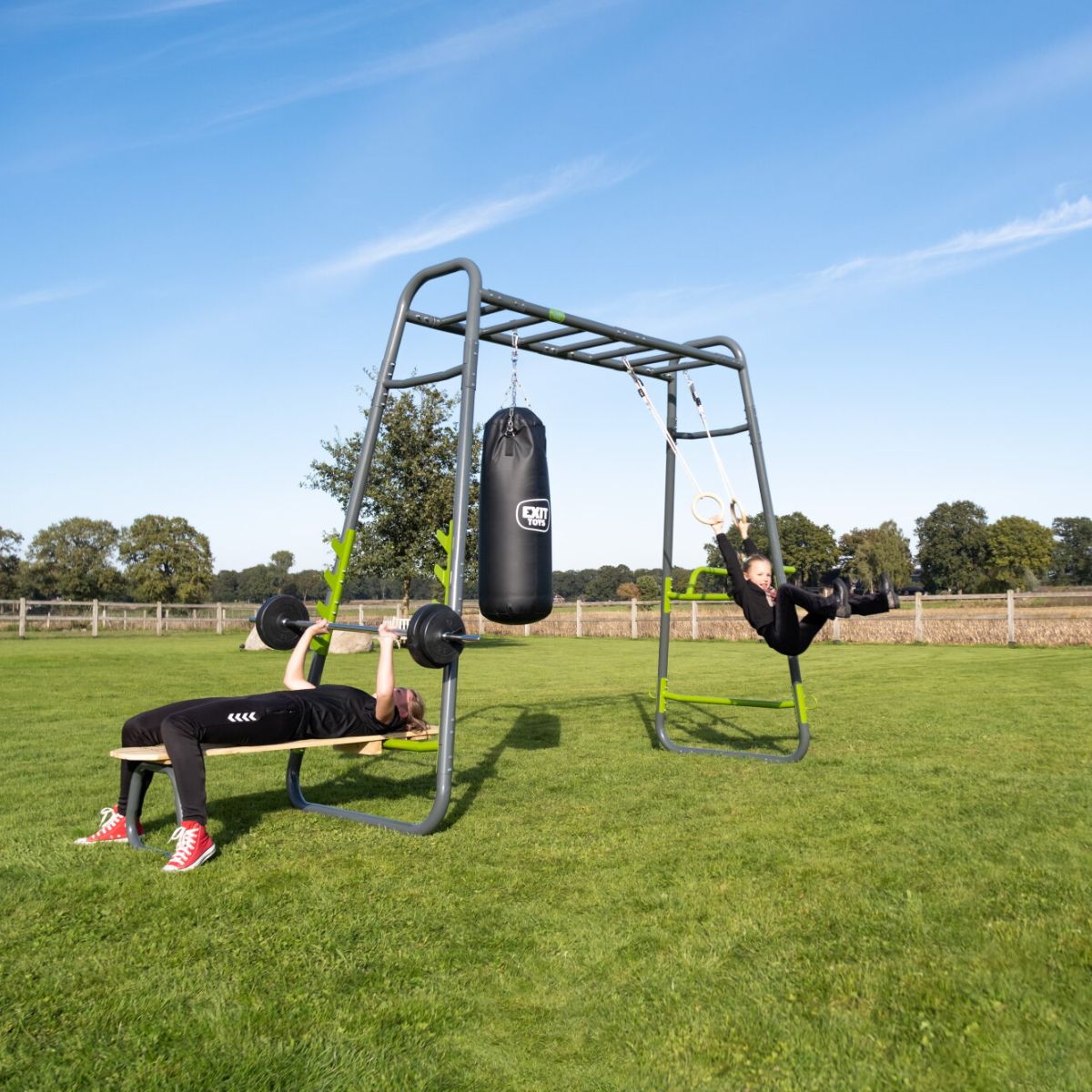 ¿Quieres beneficiarte de este equipo como padre o aficionado al deporte? No hay problema. El EXIT GetSet MB200 está diseñado para transformarse fácilmente en un rack de fitness funcional. Entrena brazos, hombros, espalda o core simplemente colgándote del marco y pasando de una barra a otra. Añade accesorios como un saco de boxeo o una estación de fondos y crea tu propio entrenamiento personalizado al aire libre. Así, puedes entrenar donde y cuando quieras, sin necesidad de una membresía de gimnasio.