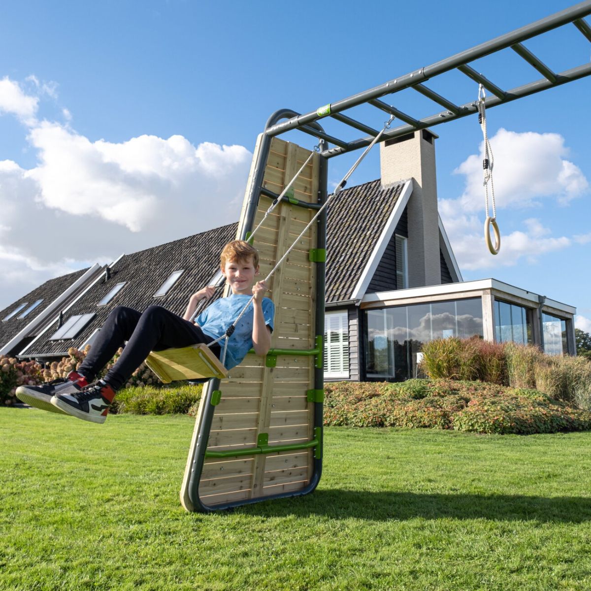 Geef jouw kind het ultieme buitenspeelgevoel met de EXIT GetSet houten schommel. Deze natuurlijke en stijlvolle schommel is speciaal ontworpen voor bevestiging aan de GetSet monkeybars MB200 en MB300. Of het nu gaat om rustige momenten of uitbundig speelplezier: schommelen blijft een tijdloos favoriete activiteit waarmee je kind ontspanning en beweging combineert – gewoon in de eigen tuin.