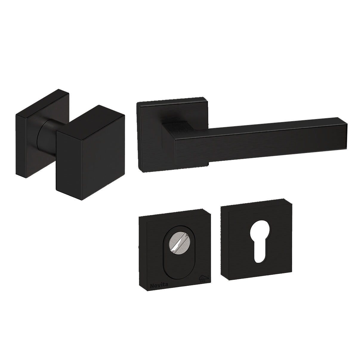 De voordeurset vierkant met Quadro 50 zwart is een stijlvolle en veilige keuze voor uw voordeur. De set bestaat uit een blind te monteren voordeurknop, een SKG*** gekeurd veiligheidsrozet met kerntrekbeveiliging en een haakse deurkruk voor de binnenzijde. De deurkruk is voorzien van een veermechanisme en kan universeel worden gebruikt, zowel links als rechts.