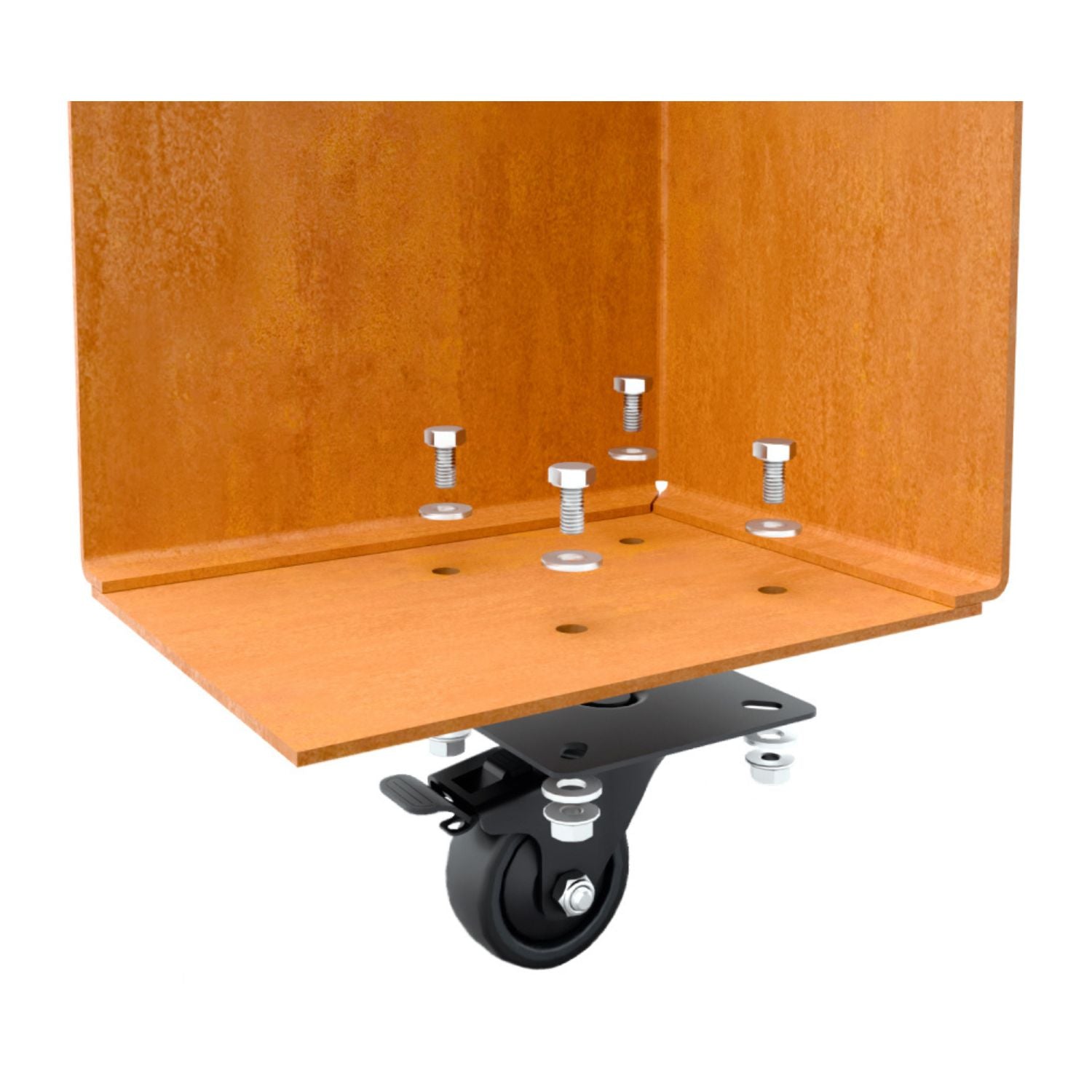 Vierkante cortenstalen plantenbak met wielen 40x40x80 cm