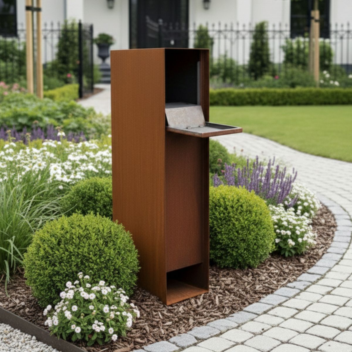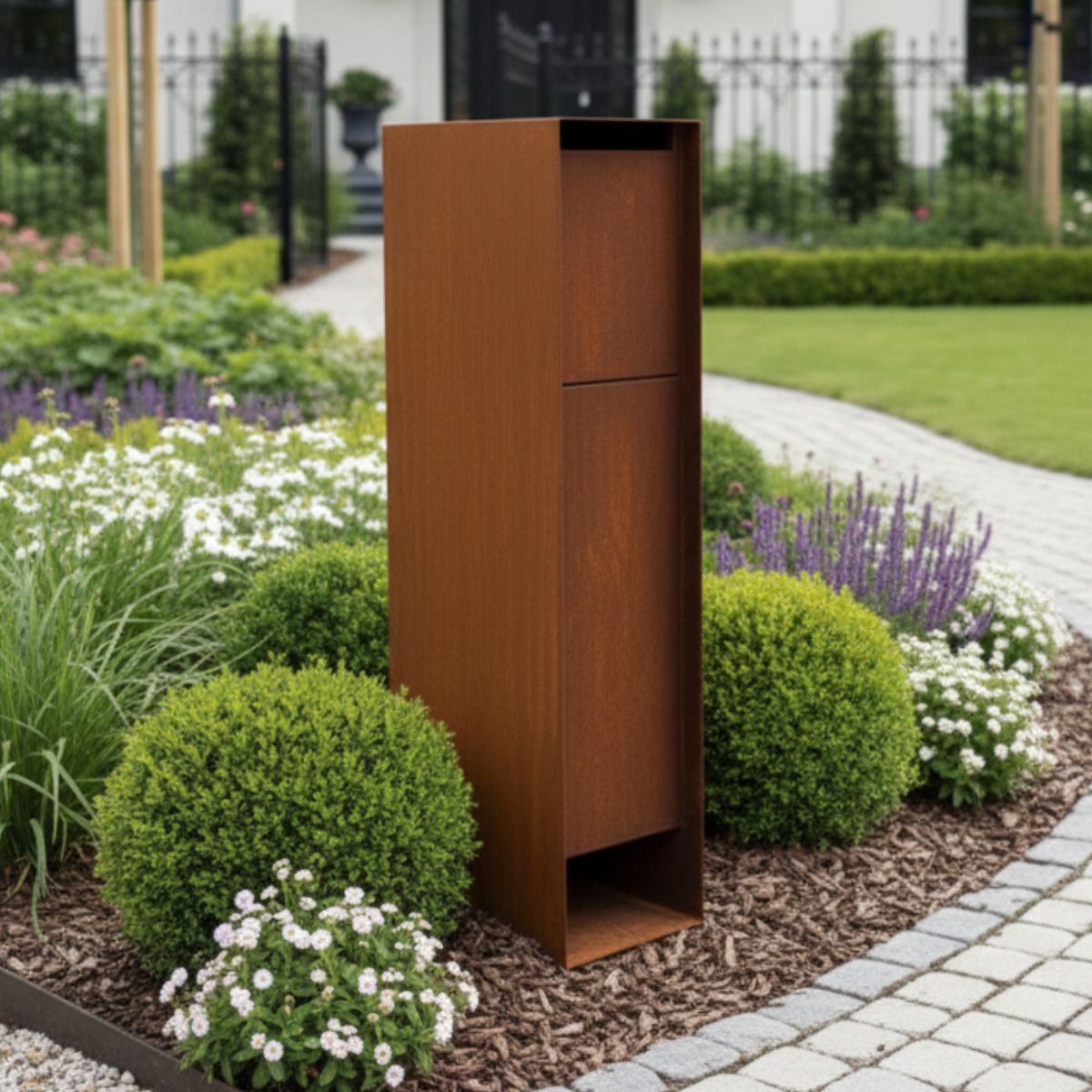 L'acier Corten est réputé pour sa longue durée de vie et son entretien facile. Au lieu de rouiller, le matériau forme une couche protectrice au fil du temps. Cela offre non seulement une protection supplémentaire, mais confère également à la boîte aux lettres un aspect chaleureux et naturel qui s'intègre parfaitement à tout jardin ou allée moderne.
