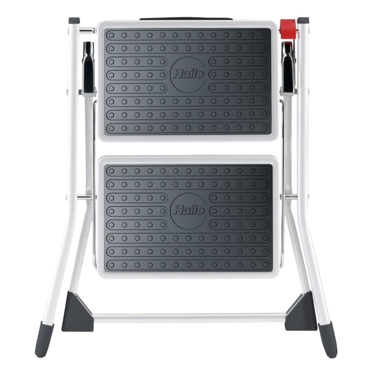 Les deux marches spacieuses sont équipées de tapis antidérapants pour une adhérence optimale. Grâce aux pieds en plastique robustes et à la poignée pratique, vous pouvez travailler en toute stabilité et en toute confiance.