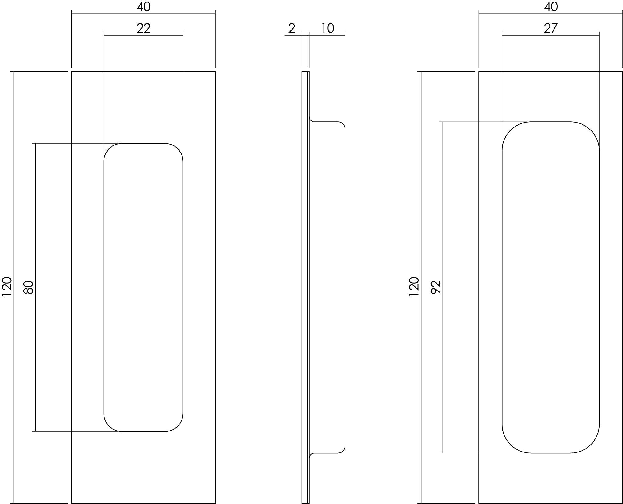 Cette poignée de porte coulissante rectangulaire est fabriquée en acier inoxydable puis dotée d'un revêtement en poudre noir mat. L'utilisation de l'acier inoxydable confère à ce bol une longue durée de vie. Cette poignée de porte coulissante s'intègre entièrement dans la porte et a une hauteur de 120 mm et une largeur de 40 mm. Poignée de porte coulissante