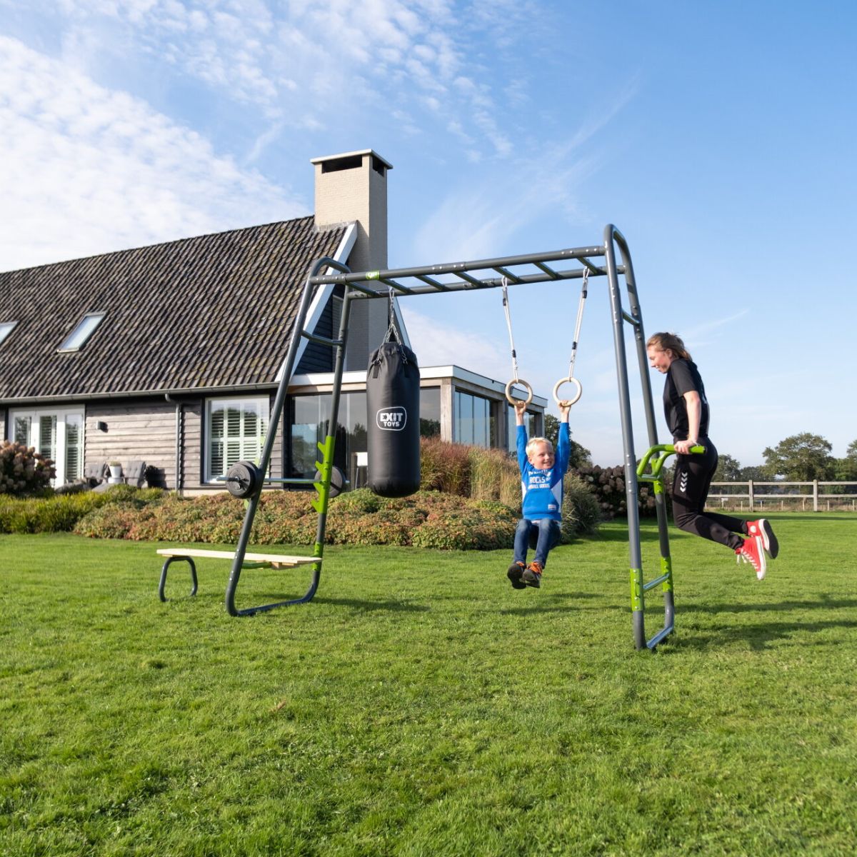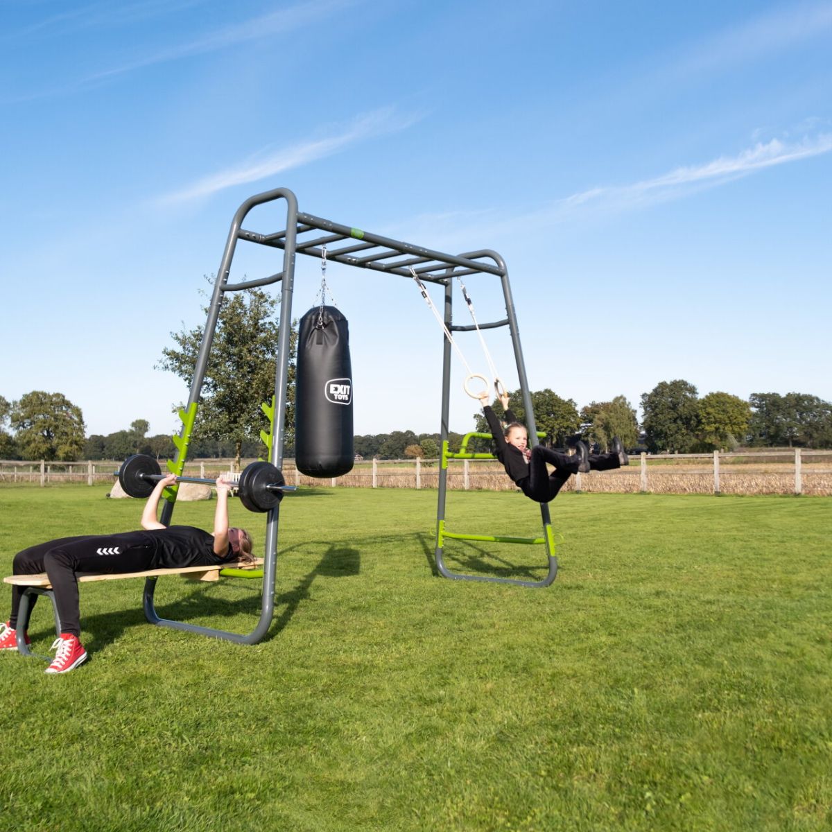Vous souhaitez transformer votre jardin en espace d'entraînement personnel pour vous et vos adolescents sportifs ? La barre de singe EXIT GetSet MB230 est un support de fitness extérieur multifonctionnel de plus de quatre mètres de long, spécialement conçu pour les jeunes de 14 ans et les adultes actifs. Grâce à l'ensemble complet de sept accessoires de haute qualité – comprenant un banc de fitness, un sac de frappe et des supports d'haltères – cet appareil offre un entraînement complet du corps en plein air. Entraînez-vous quand vous le souhaitez, sans compromis.