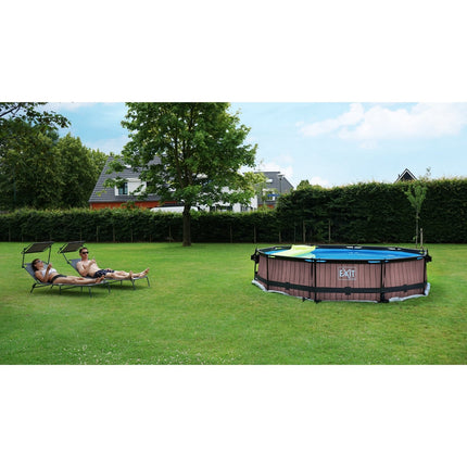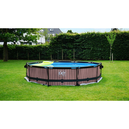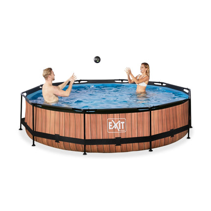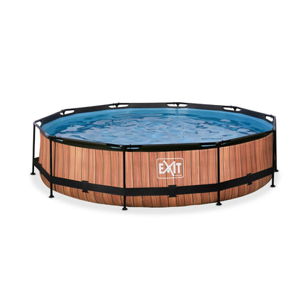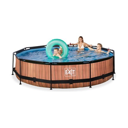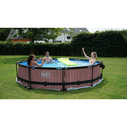 La piscine EXIT Wood ø450 x 122 cm est une piscine à structure ronde aspect bois et auvent. La piscine est équipée en standard d'une pompe de filtration à sable, d'une pompe à chaleur et d'un escalier de piscine, avec lesquels vous pouvez entrer et sortir de la piscine en toute sécurité. La piscine Wood présente sur le côté un motif en bois moderne et frais, ce qui en fait un véritable accroche-regard dans le jardin. L'intérieur de la piscine est bleu, pour une sensation de fraîcheur. La piscine EXIT est équipée de parois solides à 3 couches en PVC et polyester. La forme ronde de la piscine crée une atmosphère chaleureuse et vous permet de profiter facilement de la piscine à plusieurs.